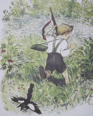 Любил Никита с игрушечным ружьём играть, на свои игрушки охотиться. А летом пошёл с отцом в поле и ружьё взял. Увидел сорочонка и выстрелил. Сорочонок испугался, закричал, в сторону бросился. Никита тоже бежит, плачет - испугался.